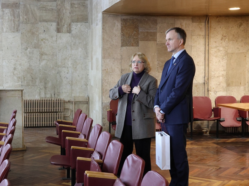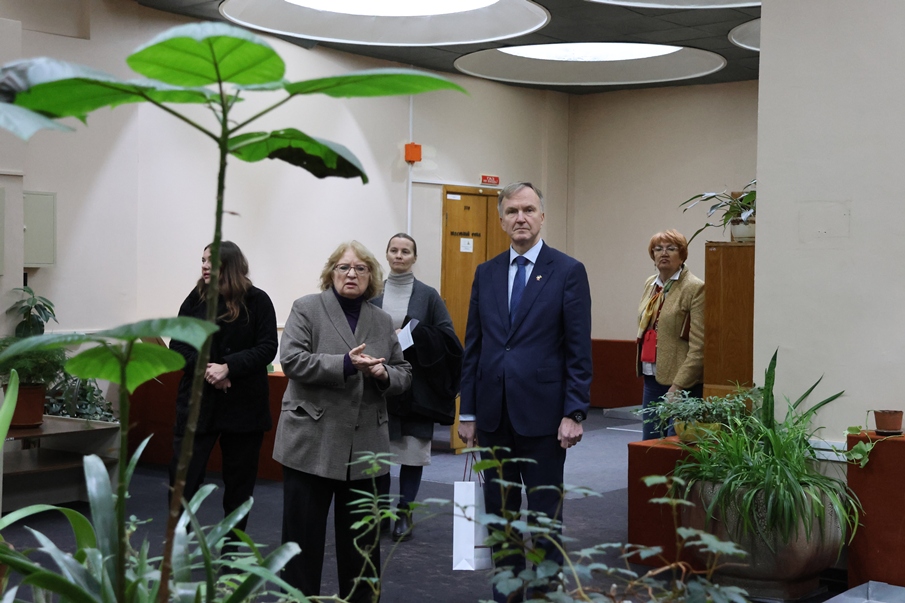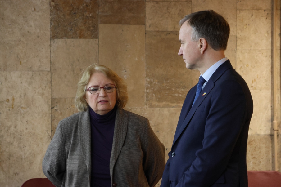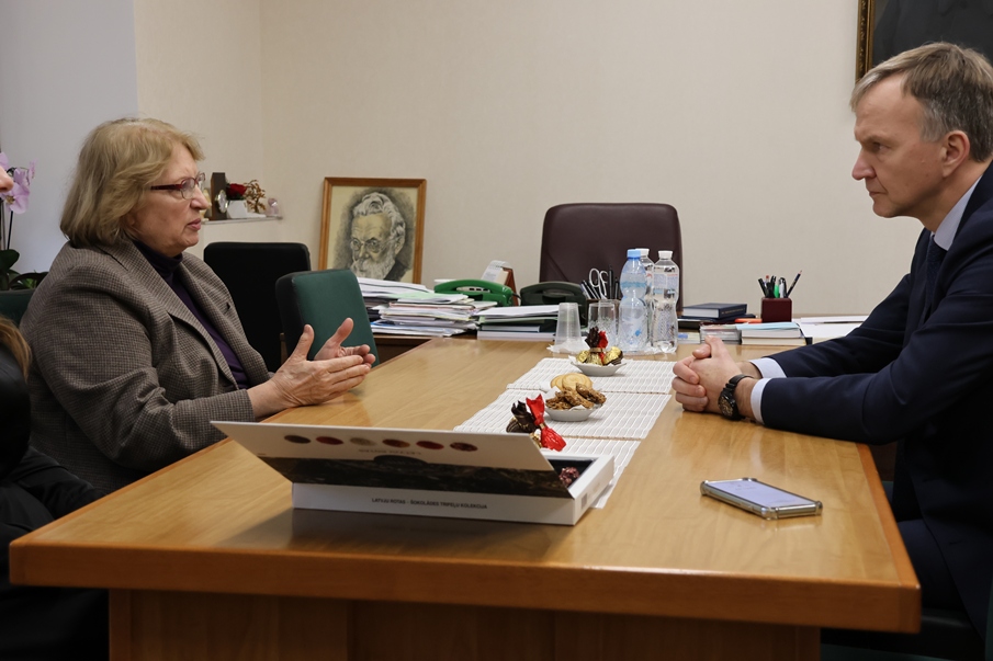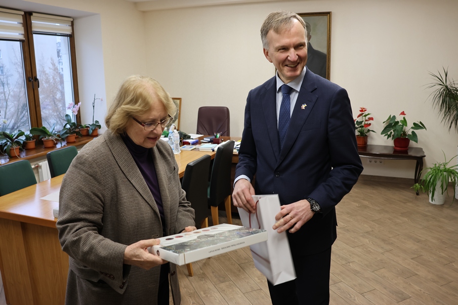 Гостя зустріли генеральний директор НБУВ, член-кореспондент Національної академії наук України Любов Дубровіна, координаторка міжнародної діяльності НБУВ Людмила Дем’янюк, т.в.о завідувача відділу міжнародної інформації та зарубіжних зв’язків Леся Філімончук. Як зазначила, вітаючи пана Посла, Любов Дубровіна, ознайомлення з нашою бібліотекою в корпусі на Голосіївському проспекті є лише початком, оскільки більшість раритетних документів і цінних артефактів акумулюються в історичному корпусі НБУВ на вулиці Володимирській. Але цей візит є дуже важливим для нас знайомством, адже зв’язки нашої установи з латвійськими колегами мають тривалу історію, і ці взаємини завжди були плідними, професійними, їх вирізняли колегіальне й людське взаєморозуміння, бажання обмінятися корисним досвідом.