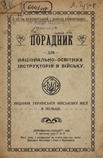 Книги, які ми вважаємо навчальними з військової підготовки, наявні у фонді в незначній кількості (підручники, посібники, порадники, документальні виклади/збірники, лекції, промови, довідкові видання тощо). Це такі видання: Білозерський О. П. Порадник для національно-освітних інструкторів в війську (Перемишль ; Ланьцут : Вид. Укр. військ. місії в Польщі, 1920. – 32 с.); Вєдєнєєв Д. В. «Повстанська розвідка діє точно й відважно…». Документальна спадщина підрозділів спеціального призначення Організації українських націоналістів та Української повстанської армії. 1940–1950-і роки (Київ : К. І. С., 2006. – 568 с. : фот. – (Серія «Таємні війни» – історія та сучасність ; кн. 3); Війна й техніка : воєнно-наук. зб. ([Paris] : [б. в.], 1938. – 111, [2] c. : іл., портр., к., схеми); Володимир. Священний героїзм як основа українського національного світогляду. Доповідь виголошена в Ольдгамі, дня 24-го серпня 1957 р. на 3-му з’їзді філії Легії українських повстанців у Великій Британії. – 2-ге вид. (Лондон : Орден, 1964. – 31 с.); Голобуцький В. О. Чорноморське козацтво (Дніпропетровськ : Січ, 2008. – 494, [2] с. : табл., к.); Давний Р. Про Січових Стрільців (Відень : Чорногори, 1921. – 79, [1] с. : іл., фот.); Денник Начальної Команди Української Галицької Армії (Нью-Йорк, Н. Й. : Червона калина, 1974. – ХІІ, 325 с. : іл.); Кентій А. Збройний чин Українських Націоналістів, 1920–1956 : історико-архівні нариси. Т. 2. Українська повстанська армія та збройне підпілля Організації українських націоналістів. – 1942–1956 (Київ : Держ. ком. архівів України, Центр. держ. архів громад. об’єднань України, 2008. – 414, [2] с.); Кравцевич В. Украинский державный флот (Киев : Край, 1992. – 171, [2] с. : рис., ил., портр.); Кук В. УПА в запитаннях і відповідях Головного Командира (Львів : Галицька вид. спілка, 2007. – 80 с.); Начерк підручника для українських молодших старшин й підстаршин (Саскатун : Вид. «Укр. Стрілецької Громади в Канаді», 1938. – 413 с. : рис., схеми); Патриляк І. К. Військова діяльність ОУН (б) у 1940–1942 роках (Київ : КНУ ім. Тараса Шевченка ; Ін-т історії України НАН України, 2004. – 598 с.); Перспективи української національно-визвольної революції : вишкільні матеріяли з курсу влаштованого Проводом ЗЧ ОУН. Кн. 1. ([Б. м.] : Вид. Організаційно-Кадрової Референтури [ЗЧ ОУН], 1958. – 165, [3] с. – (Серія : Б-ка укр. підпільника ; Підручн. для формування нац. свідомості українців ; кн. 1 ; Матеріял тільки для внутрішньо-організаційного користування); Семотюк Я. Українські військові відзнаки : ордени, хрести, медалі та нашивки (Торонто : [б. в.], 1991. – 51, [1] с. : фот.); Семотюк Я. Українські військові нагороди : ордени, хрести, медалі та нашивки. 2-ге вид., доп. (Торонто : [б. в.], 2004. – 64 с. : фот.); Стефанів З. Українські збройні сили в 1917–1921 рр. : воєнно-іст. нарис. Ч. І (Коломия : Наша Слава, 1935. – 121, [2] с. : іл.); Стефанів З. Українські збройні сили, 1917–1921 рр. Ч. 1. Доба Центральної Ради й Гетьманату. – 2-ге вид., справл. ([Новий Ульм ; Мюнхен] : Союз українських ветеранів, 1947. – 118, [1] с. : іл., схеми, к.); Українська революція 1917–1921 рр. : подвиг героїв Крут : матеріали наук. читань [24 січня 2008 р., м. Ніжин] (Київ : Вид-во ім. О. Теліги, 2008. – 176 с.); Український визвольний рух у боротьбі з НКВД-КҐБ : вишкільні матеріали з курсу влаштованого Проводом ЗЧ ОУН. Кн. 2. – [Б. м.] : Вид. Організаційно-Кадрової Референтури [ЗЧ ОУН], 1958. – 144 с. – (Серія : Б-ка укр. підпільника ; Підруч. для формування нац. свідомості українців ; кн. 2; Матеріял тільки для внутрішнього ор