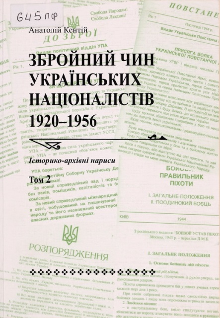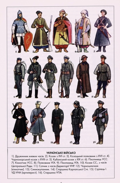 На виставці представлені книги, в яких йдеться про збройні сили різних історичних етапів боротьби України за свою державність. Зокрема: Kumke C. Führer und Geführte bei den Zaporoger Kosaken : Struktur und Geschichte kosakischer Verbände im polnisch-litauischen Grenzland (1550–1648) (Berlin : Osteuropa-Institut an der Freien Universität Berlin; Wiesbaden : Otto Harrassowitz, 1993. – 551 s.); Martowych O. The Ukrainian Insurgent Army (UPA) (München : Ukr. Information Service, 1950. – 76 p.); Sodol P. R. UPA : they fought Hitler and Stalin ; a brief overview of military aspects from the history of the Ukrainian Insurgent Army, 1942–1949 (New-York : Committee for the World convention and reunion of soldiers in the Ukr. Insurgent Army, 1987. – 128 p.); Тернистий шлях Другої дивізії УНА. Створення УНК і Другої дивізії УНА (Ню Йорк ; Кліфтон : Об-ня вояків і приятелів Другої Української Дивізії УНА, 1994. – 161 с.); Бульба-Боровець Т. Армія без держави (Львів : Поклик сумління, 1993. – 166 с.); Бульба-Боровець Т. Армія без держави. Слава і трагедія Українського повстанського руху : спогади (Вінніпег : [б. в.], 1981. – 326 с.); Дзьобак В. В. Тарас Бульба-Боровець і його військові підрозділи в українському русі опору (1941–1944 рр.) (Київ : Ін-т історії України НАН України, 2002. – 260 с.) тощо.