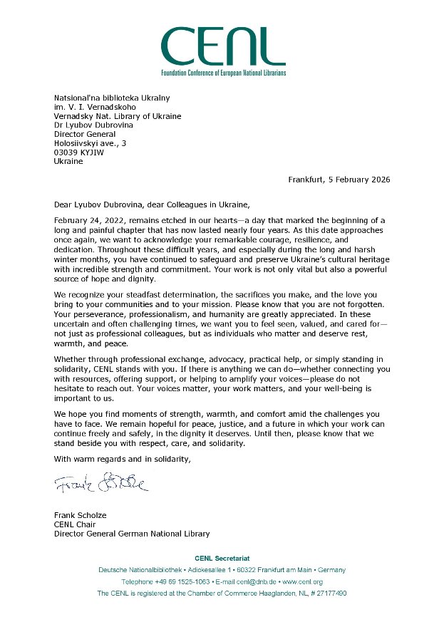 Франк Шольц, Голова CENL, генеральний директор Німецької національної бібліотеки надіслав листа генеральному директору НБУВ Любові Дубровіній про солідарність CENL і безумовну підтримку