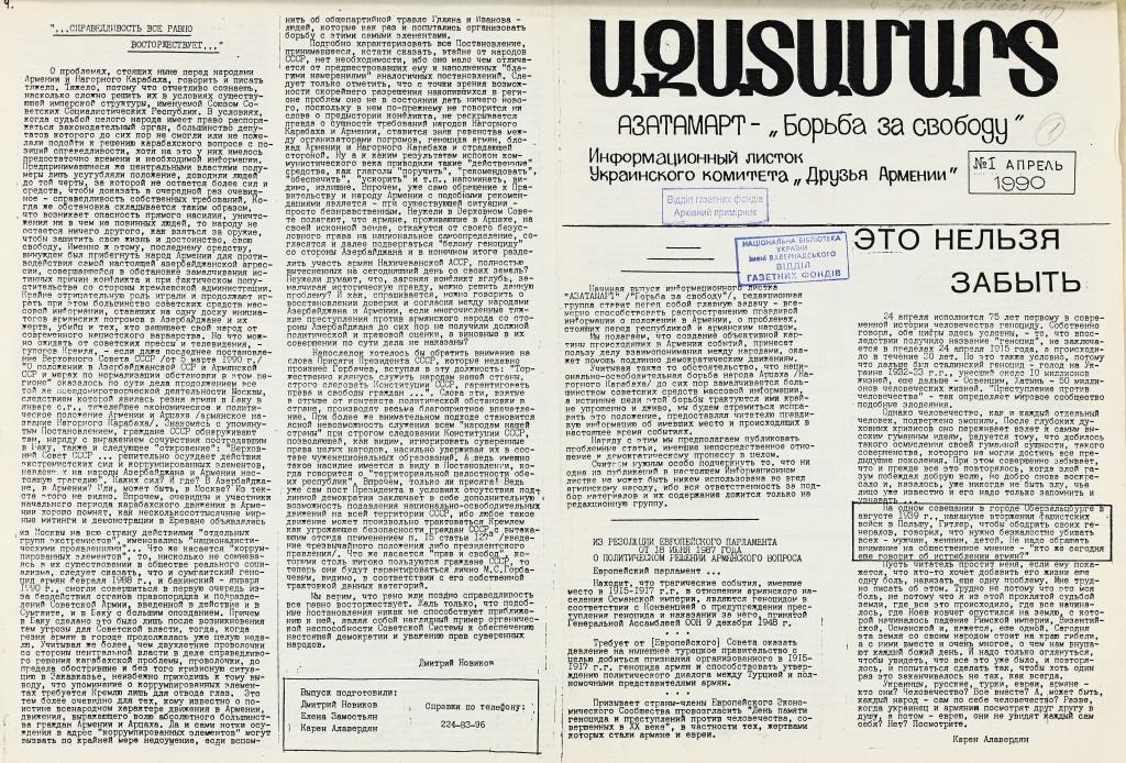 Звертають на себе увагу також газети «Ватан» («Батьківщина») – кримськотатарська газета, що друкувалася в Сімферополі в 1989 році та «Азатамарт» («Борьба за свободу») – информационный листок Украинского комитета «Друзья Армении». – Київ, 1990.