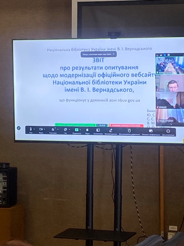 Ю.С. Ковтанюк зробив також звіт про результати опитування щодо модернізації офіційного веб-сайту НБУВ. Він супроводжував результати опитування цифровою презентацією. Після детального обговорення звіту та висловлення зауважень і пропозицій його схвалено. Погоджено рішення розширити це опитування, щоб охопити більшу кількість респондентів.