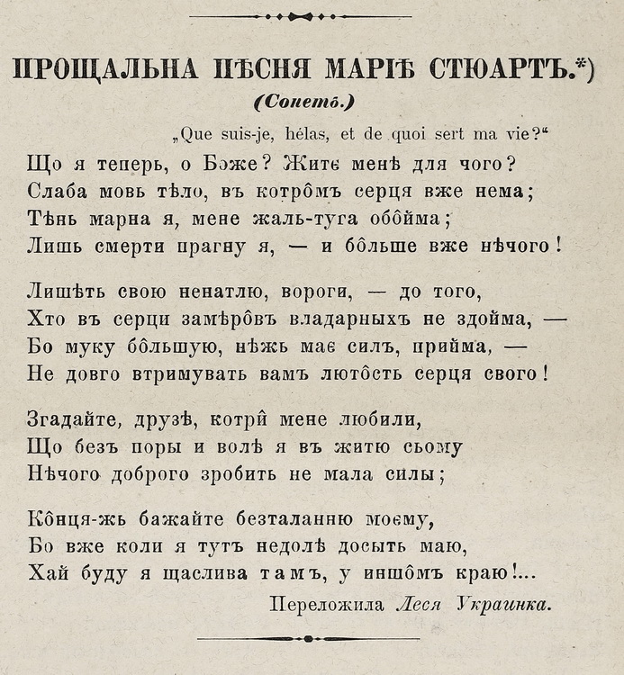 У 1888 р. на сторінках журналу «Зоря» було опубліковано такі твори Лесі Українки: «Чого то часами, як сяду за діло…» (№ 4, с. 63), ліричний вірш «Пісня» (№ 16, с. 261) та сонет «Прощальна пісня Марії Стюарт» (№ 24, с. 405).