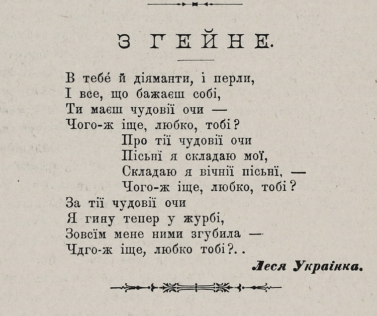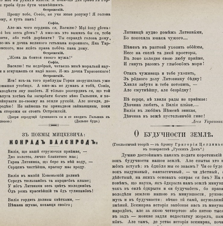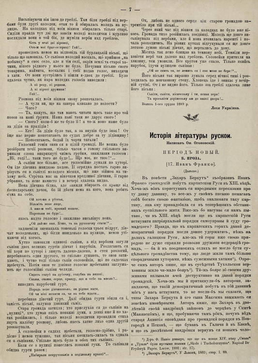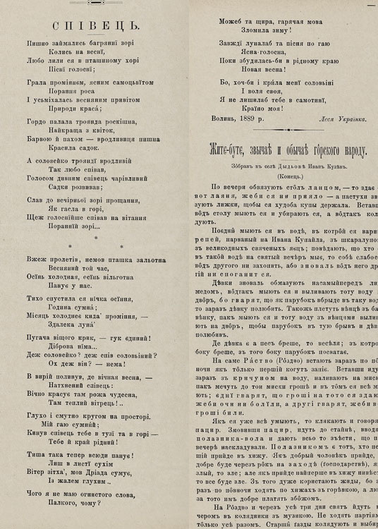 1889 р. став роком активної перекладацької діяльності поетеси. У журналі було надруковано її переклади творів німецького поета Генріха Гейне: «Вони мене дражнили…», «Чого так поблідли ті рожі ясні?», «Як я про свою говорив вам печаль» (№ 1, с. 5). У № 2 (с. 24–25) було опубліковано перший прозовий твір Лесі Українки — «Така її доля» (перше реалістичне оповідання про трагічну долю жінки).