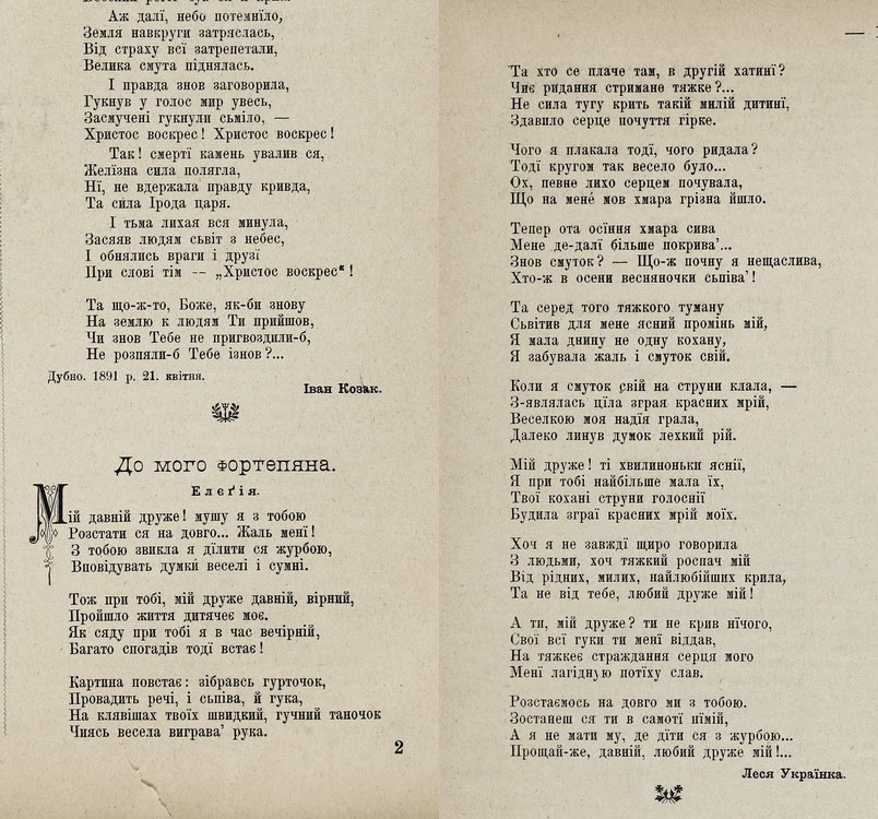 Перші літературні твори юної Лариси Косач були опубліковані у львівському літературно-науковому і громадському двотижневому часописі «Зоря» (1880–1897), який з 1885 р. став органом Літературного товариства ім. Т. Шевченка (згодом — Наукового товариства ім. Т. Шевченка).