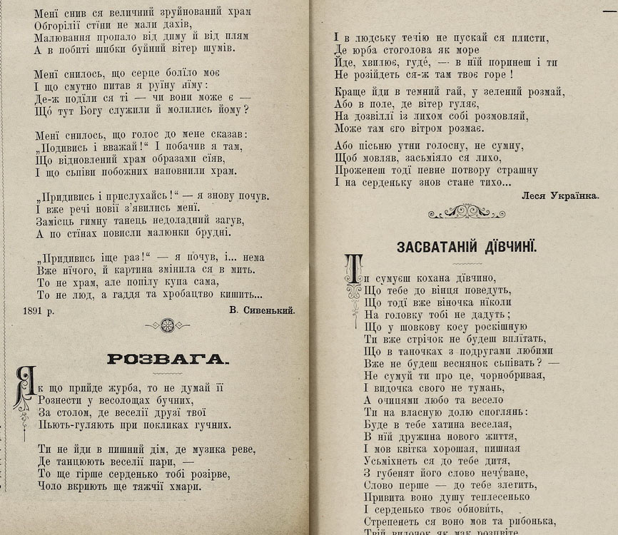 Крім того, цього ж року з’явилася низка її поезій: «Завітання» (№ 2, с. 25), «До природи» (№ 8, с. 133 — зразок пейзажної лірики), «Напровесні» (№ 9, с. 150 — вірш-маніфест ранньої інтимно-пейзажної лірики, що увійшов до збірки «На крилах пісень»), «Співець» (№ 21, с. 350–351), «В’язень» (№ 23, с. 335 — зразок громадянської лірики) та «Святий вечір!» (№ 24, с. 286–287).