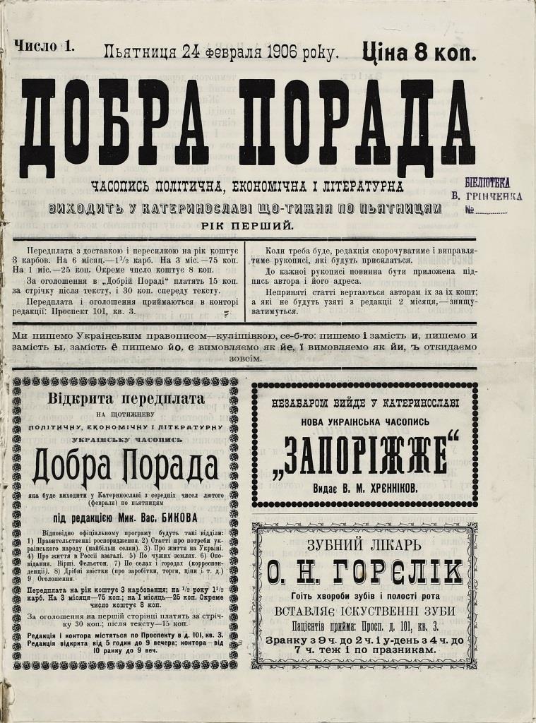 - Добра порада. Редактор-видавець М. В. Биков, з № 2 – редактор-видавець В. Лозинський. – Катеринослав, 1906.
