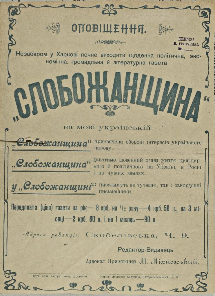 - Слобожанщина. Редактор-видавець М. Міхновський. Вміщено оголошення про скорочене зразкове число через непорозуміння з друкарнею. – Харків, 1906.