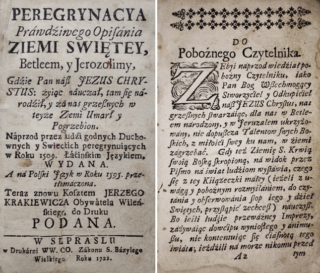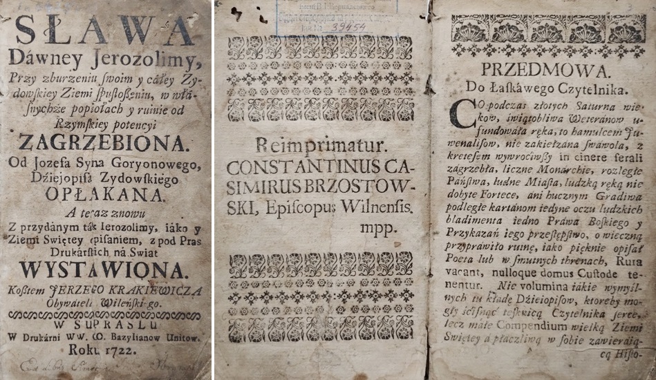 Зберігається у відділі рідкісний видавничий конволют у складі двох перекладених польською мовою видань 1722 р.: твору історика І ст. Йосипа Флавія «Sława dawney Jerozolimy, przy zburzeniu swoim y całey zydowskiey ziemi spustoszeniu, w własnychże popiołach y ruinie od Rzymskiey potencyi zagrzebiona» (іл. 3) та опису подорожі до Святої Землі польського мандрівника та проповідника Ансельма Бернардина «Peregrynacya prawdziwego opisania Ziemi Swiętey, Betleem, y Jerozolimy» (іл. 4). Релігійну тематику продовжує твір із моральної теології секретаря луцького та берестейського єпископа Яна Ігнатія Темезварі «Anima pænitens ad regulas præceptorum decalogi» 1726 р. (іл. 6)