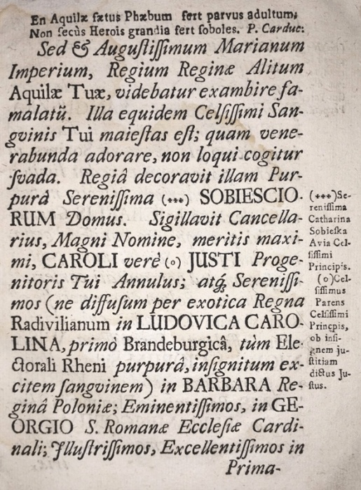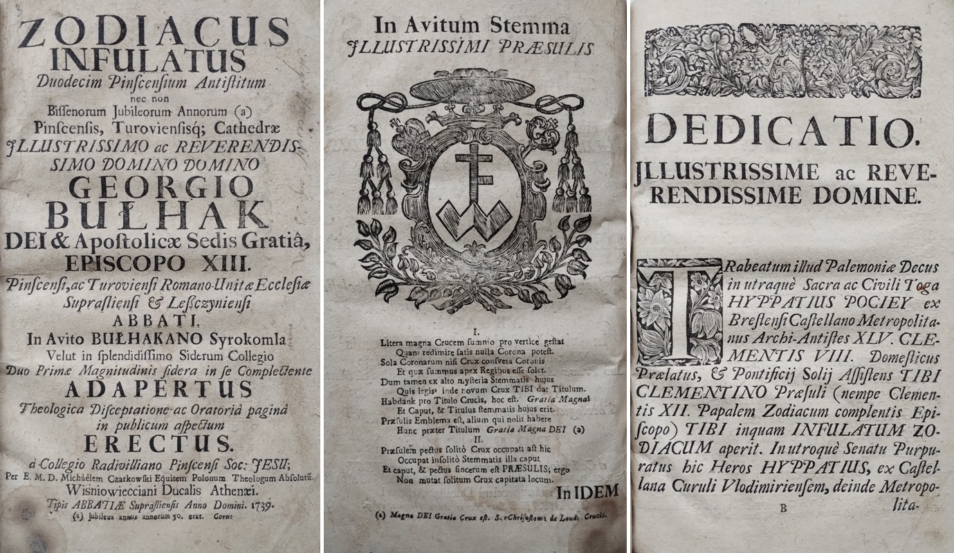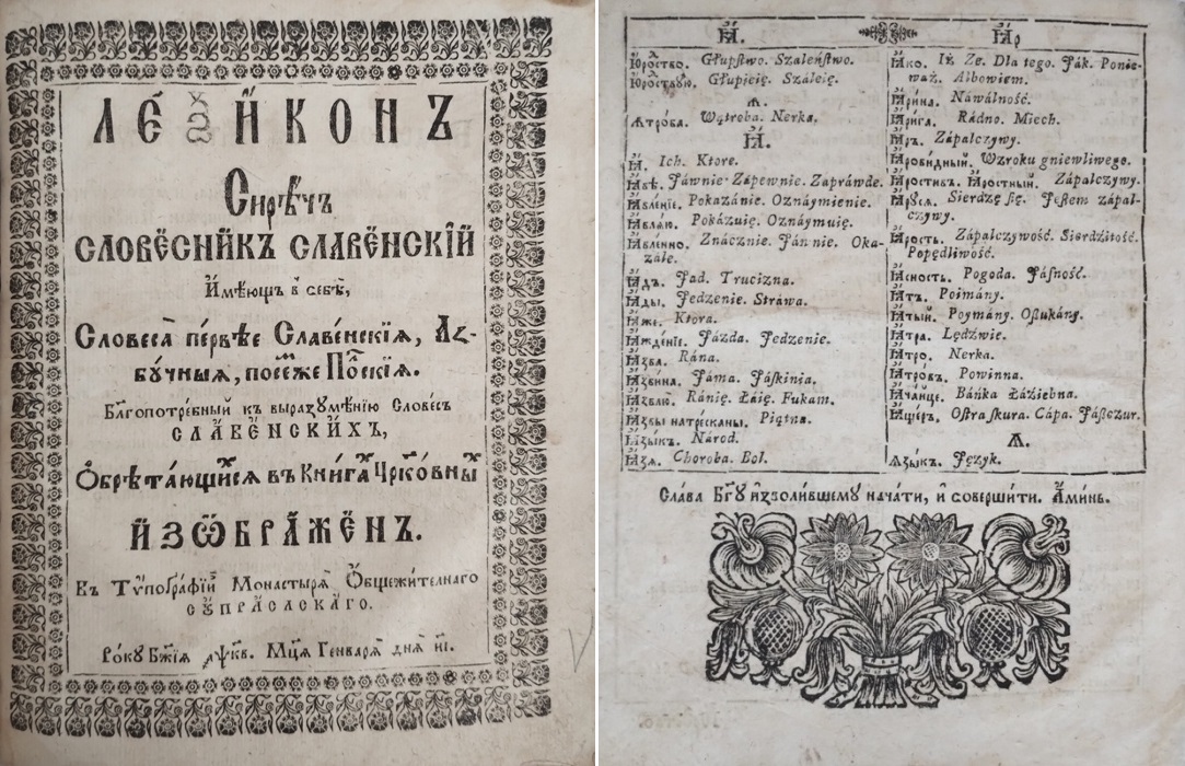 Увагу супрасльського осередку до вшанування регіональних святинь демонструє видання опису церемонії коронації Жировицької ікони Божої Матері, яка відбулась у 1730 р. Опис під назвою «Aquila grandis magnarum alarum in Zyroviciana solitudine nidificans, sub corona renascens beatissima Virgo Maria» склав Теофіл Єнткевич. Титул видання оформлено в нетиповий спосіб: він містить справа від назви два позначені зірочками посилання у формі друкованих маргіналій. Примірник відділу зберігся без титульного аркуша. Варто згадати також, що в 1722 р. вийшов друком «Лексикон», тобто церковнослов’янсько-польський словник (іл. 5).
