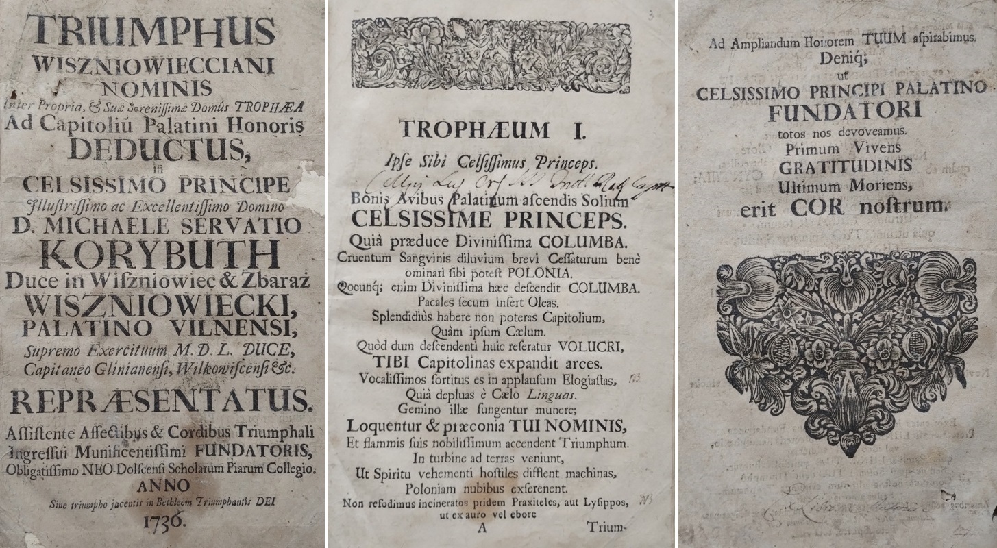 Історичній тематиці присвячено твір торунського райці, купця, бібліофіла, перекладача, письменника Якова Казимира Рубінковського про короля Яна ІІІ Собеського «Ianina zwycięskich tryumfow, dziełami y heroicznym męstwem Iana III. krola polskiego na Marsowym polu nayiasnieyszy ottomanskiey y tatarskiey potencyi» 1754 р. Видання містить дереворити, вірогідно, місцевого майстра (іл. 14–15). Гравюри скопійовано з мідеритів, вміщених у першому виданні цього твору, опублікованому в Познані в 1739 р.