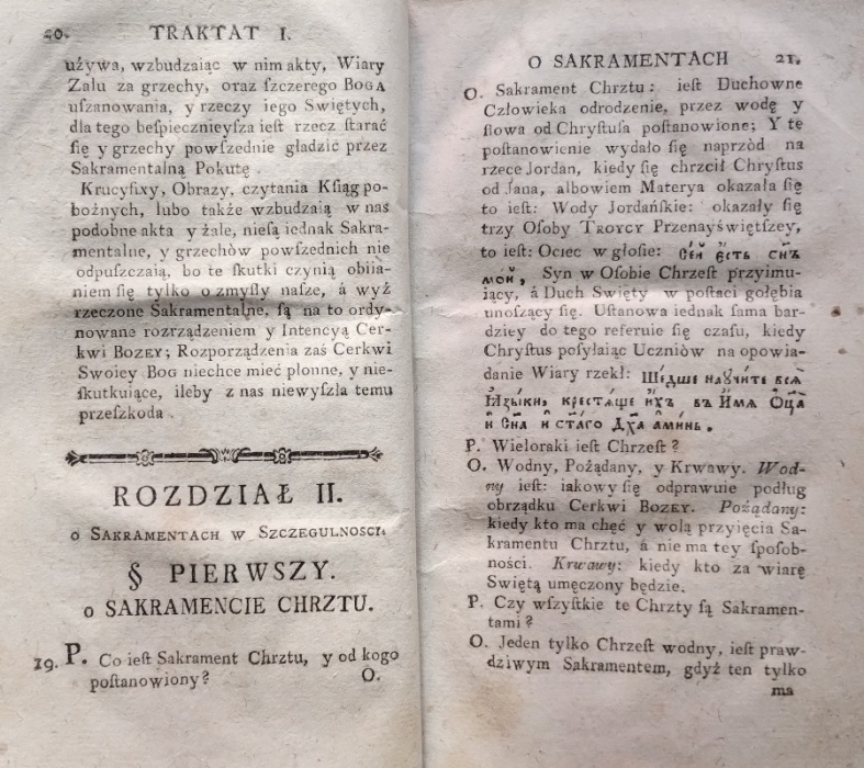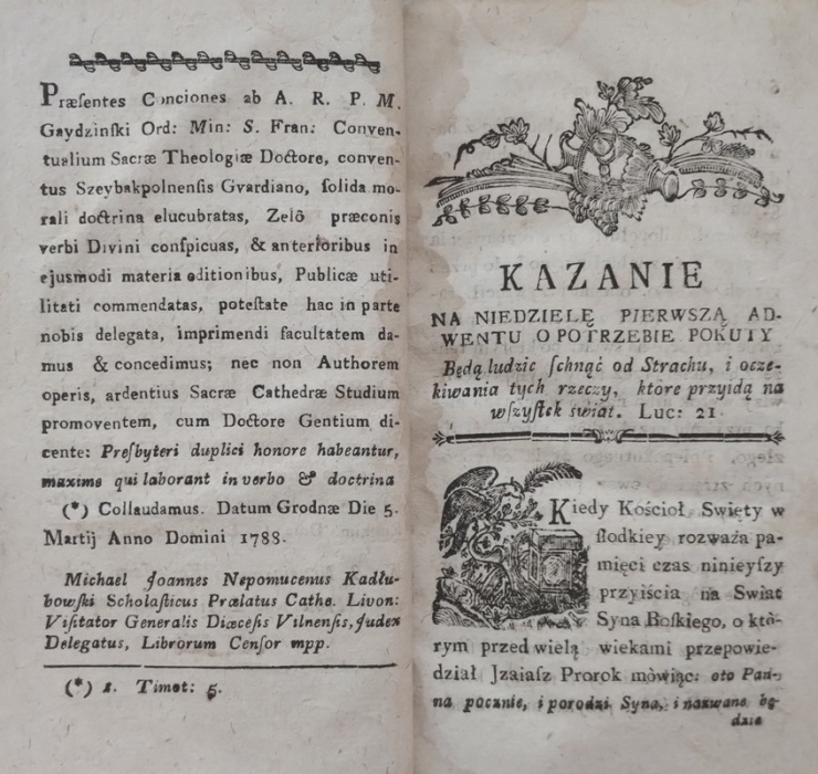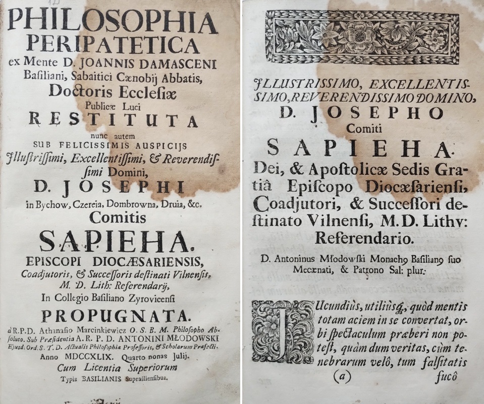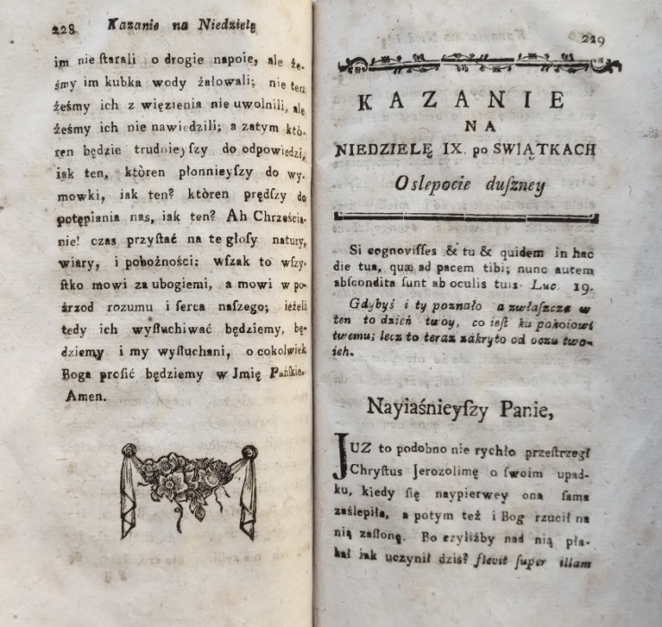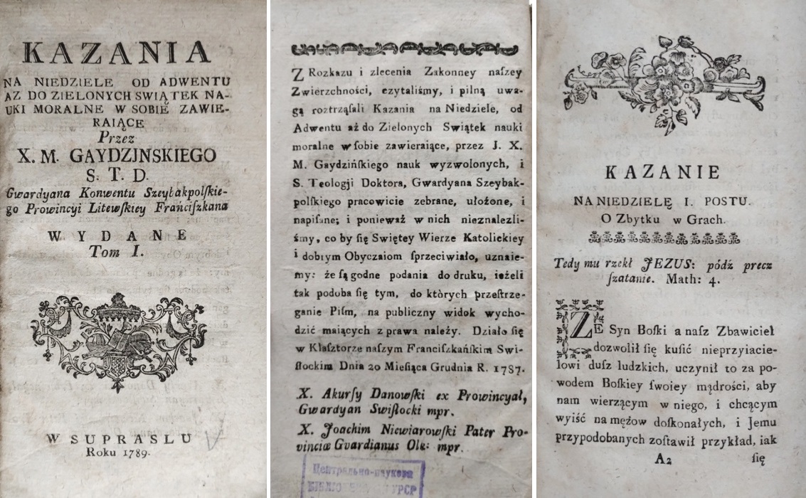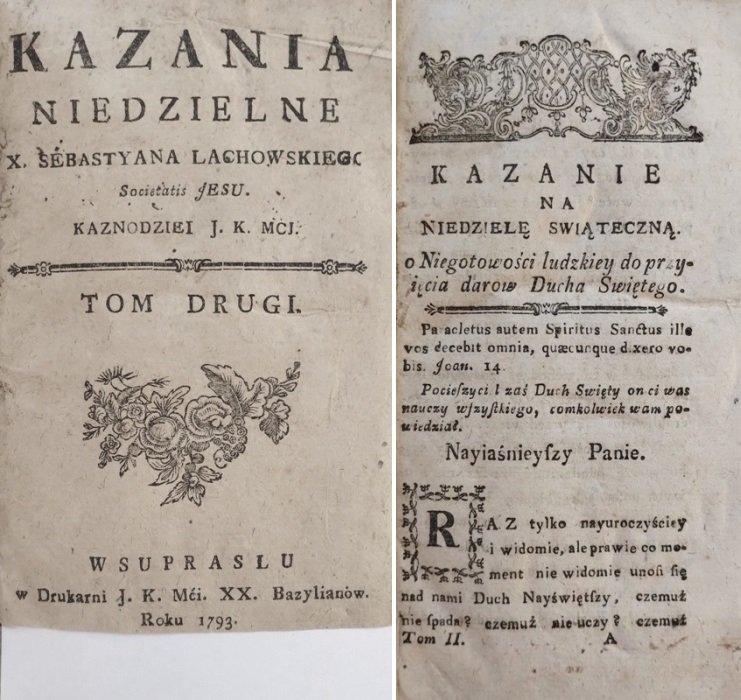 Найраніший друк, представлений на виставці, – це проповіді єзуїта Антонія Ширми «Kazania albo Exhorty postne o tajemnicach naydroszszey męki Zbawiciela», виголошені у варшавському єзуїтському костелі та надруковані в 1713 р. (іл. 1, 2). У 1714 р. було видано збірник «Kazania y homilie» київського греко-католицького митрополита, одного з фундаторів греко-католицької церкви, богослова, письменника-полеміста Іпатія Потія з доданим описом життя митрополита авторства Лева Кишки – архімандрита супрасльського монастиря з 1708 р., володимирського та берестейського єпископа з 1711 р., київського митрополита з 1714 р. Пізніше, в 1788 р. «Kazania y homilie» Іпатія Потія було перевидано в Почаєві.