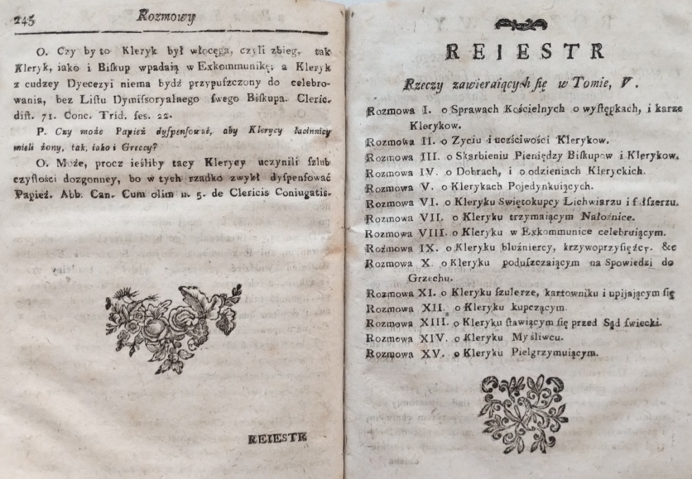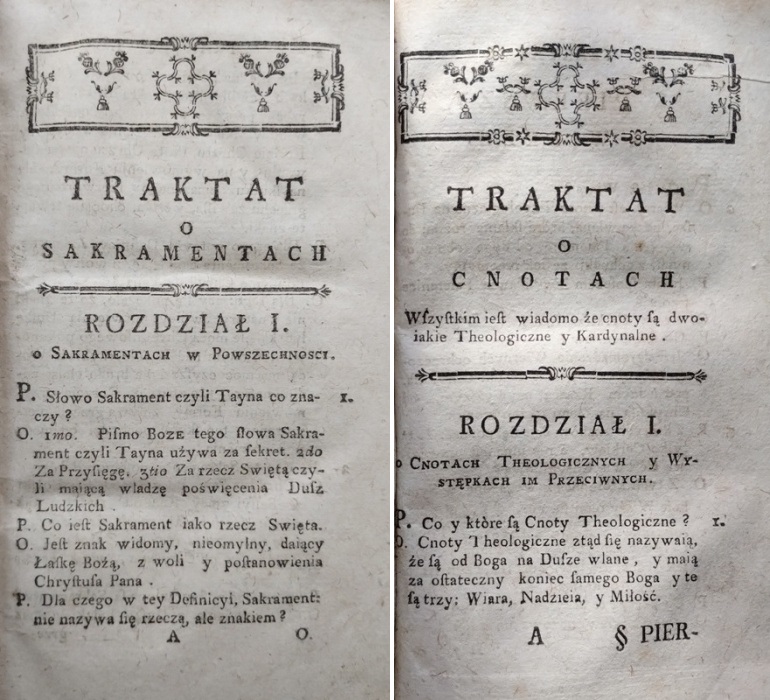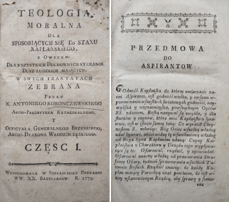 На виставці представлений примірник першого тому перекладеного польською мовою твору французького історика церкви Клода Флері «Obyczaie chrzescian», виданого в 1784 р. (іл. 26). Також є двотомні видання недільних проповідей Мартина Гайдзинського 1789 р. (іл. 28–30) та єзуїта, королівського проповідника Себастьяна Ляховського 1793 р. (іл. 31–33). Виклад канонічного права міститься у праці доктора теології та канонічного права, проповідника, отця василіанина Тимофія Щуровського під назвою «Missia bialska. Rozmowy wyięte z czwartey xięgi Prawa kanonicznego» 1792 р. (іл. 34–35).