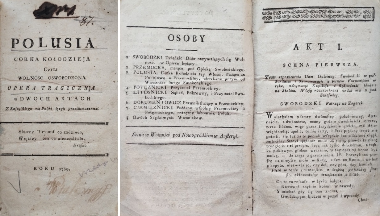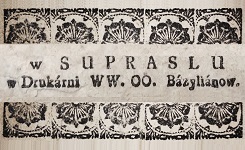 Супрасльські контрафактні видання, тобто перепубліковані без зазначення вихідних відомостей популярні у читачів, часто заборонені твори, які добре продавались і приносили прибуток, можна ідентифікувати лише за шрифтами й окремими елементами оформлення. Одне з таких видань – це надрукований анонімно політичний трактат польського громадського й освітнього діяча, письменника, публіциста, філософа Станіслава Ксаверія Сташиця «Uwagi nad życiem Jana Zamoyskiego» (1787?), в якому автор виклав план реформи державного устрою Польщі (іл. 36). В 1789 р. супрасльські друкарі видали анонімно алегоричний політичний памфлет письменника та публіциста Вінцентія Ігнатія Маревича «Polusia corka kołodzieja czyli Wolność oswobodzona. Opera tragiczna w dwoch aktach» (іл. 37).