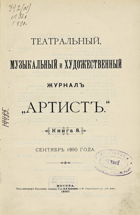Журнал «Артист» — ілюстроване театральне, музичне та художнє періодичне видання, що належало до провідних органів театральної періодики останньої третини ХІХ ст. Він виходив у Москві з вересня 1889 р. до лютого 1895 р.; друк здійснювався у друкарні «Товариства І. Н. Кушнерьова і Ко». Усього було видано 46 номерів. Засновником, видавцем і першим редактором журналу був Ф. А. Куманін. У 1894 р. (№ 37) редактором став Н. В. Новіков. Журнал виходив за театральними сезонами — з вересня до квітня — великими книжками (по сім номерів на рік). Наприкінці ХІХ ст. так званий «товстий» театральний журнал став одним із провідних типів спеціалізованої мистецької періодики. Видання містило хроніку мистецьких подій, зокрема огляди вистав в Одесі, Києві, Полтаві, Кременчуку, Миколаєві, Харкові, а також оцінки акторської гри та майстерності.