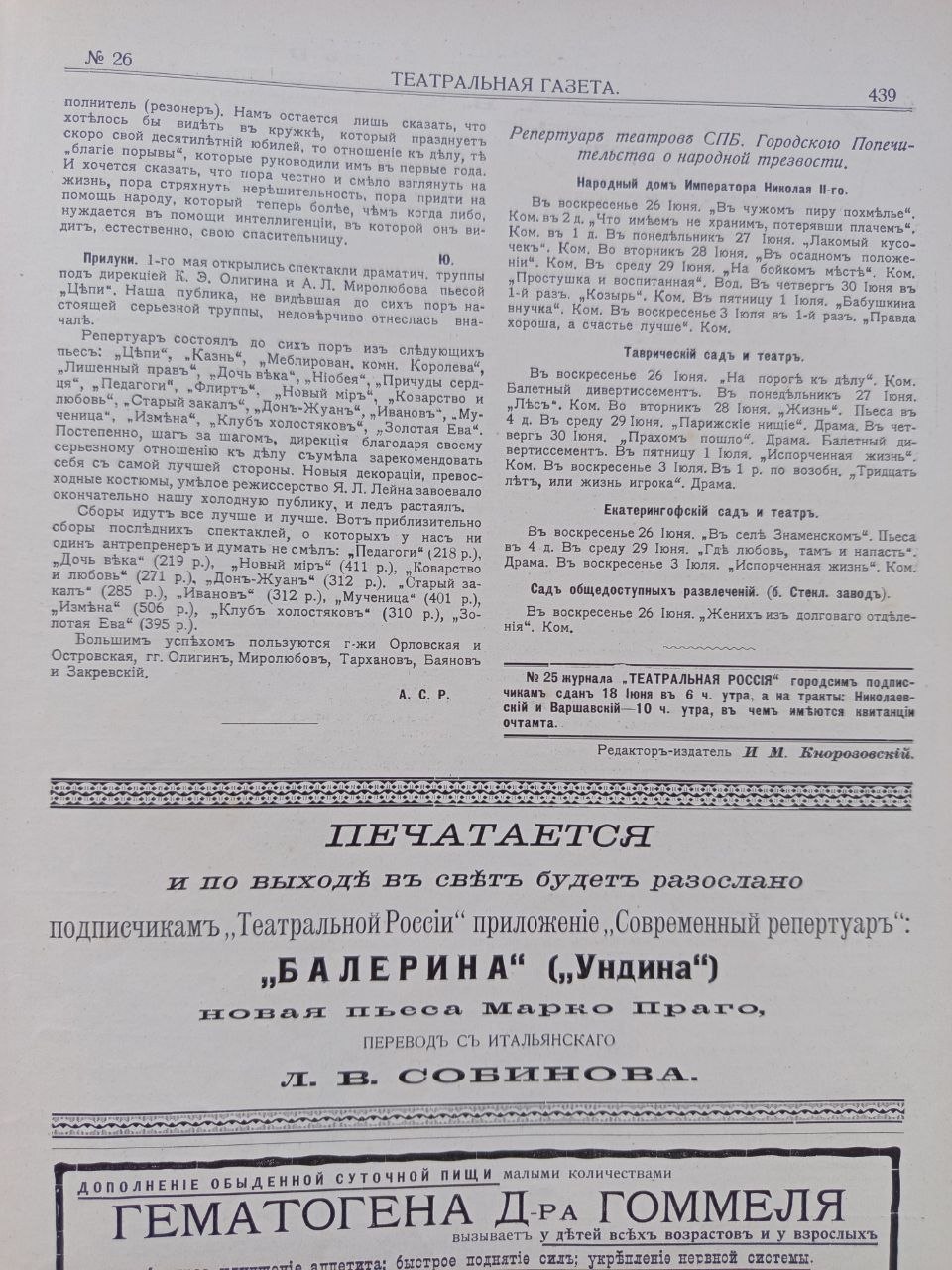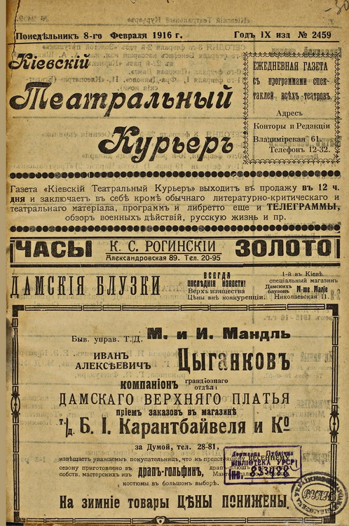 щоденна газета, що виходила у 1908–1916 рр. російською мовою. Видання публікувало програми та лібрето вистав місцевих і гастрольних театрів. Загалом було видано 2507 номерів, які збереглися до нашого часу. На сторінках газети друкувалися матеріали, присвячені літературі, мистецтву, театру, музиці та новинам кінематографа, а також рецензії, театральна хроніка та рекламні оголошення.