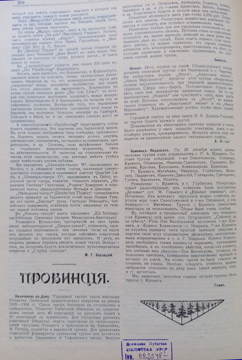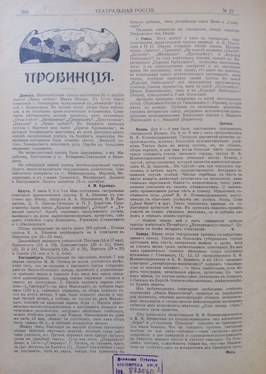 Театральний тижневик «Театральная Россия» виходив у 1904–1905 рр., у Санкт-Петербурзі під редакцією А. Кугеля, відображав широку картину життя всіх міст імперії. Видання мало інформаційно-критичний характер і виконувало функцію театральної хроніки, публікуючи рецензії, огляди сезонів та повідомлення про гастрольну діяльність. Значну увагу видання приділяло українським містам, де театральна культура на початку ХХ ст. Так, у Черкасах і Ромнах театральне життя мало епізодичний характер і залежало від мандрівних труп, а їх репертуар залежав від інтересів публіки. Така сама ситуація була і в Прилуках, де вистави відбувалися нерегулярно, здебільшого в тимчасових приміщеннях, але приїжджі колективи підтримували театральний інтерес містян. Близьким за характером був і театральний побут Кременця, де відсутність постійної трупи компенсувалася гастролями, що мали сезонний характер і залежали від загальних маршрутів мандрівних акторських колективів. Водночас Кам’янець-Подільський уже виступав як важливий регіональний осередок із більш усталеним театральним життям і регулярними виставами. Особливе місце займав Херсон, де з кінця ХІХ ст. функціонував стаціонарний театр і відбувалося насичене сценічне життя. Оголошення про вистави в повітових містах України регулярно публікувалися в журналі «Театральная Россія» разом з прізвищами задіяних акторів та деякою критикою вистав.
